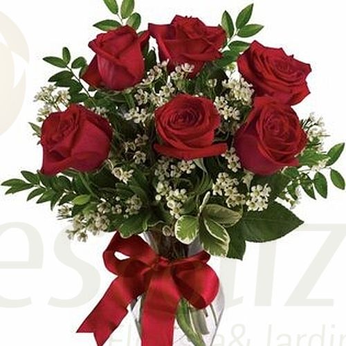 Bouquet c/ 6 Rosas Vermelhas e folhagens diversas + Jarra. (As Rosas utilizadas serão iguais à imagem ou o mais similar possível dentro da flor disponível em loja no momento)